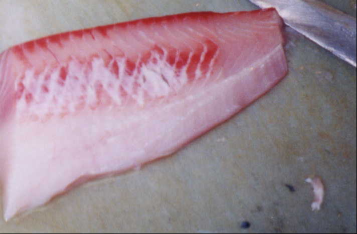 おおきなウロコは、硬くてはずれないので、そのままおろしてみました。腹骨(人間でいう肋骨)は、
