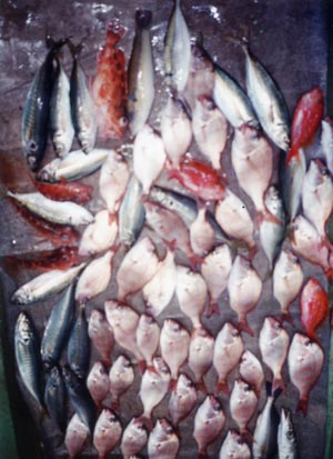 マダイ、イサギ、マアジ、丸アジ、カマス、ガシラ、他7目釣り。釣場、関電沖。