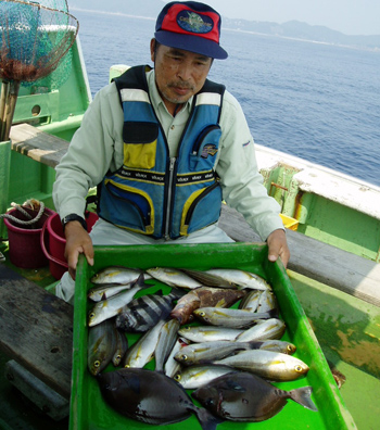 イサギ、マダイ、チダイ、マルアジ、ムロアジ、カワハギ、沖メッキ、シイラ、など楽しく釣れた。