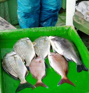 鯛28〜33糎3匹,サンバソウ28糎1匹,アジ10匹,
