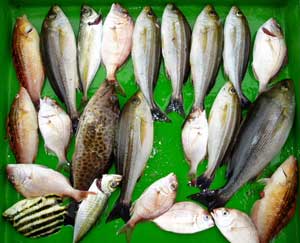 ヒラアジ、カワハギ、アズキハタ、タイ、ベラ、