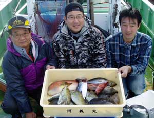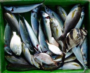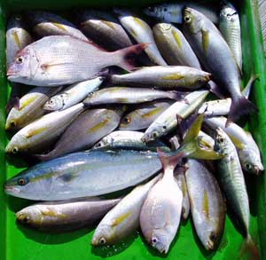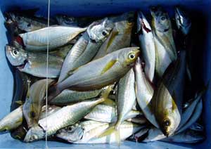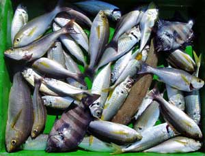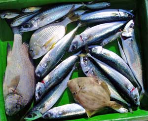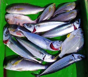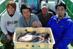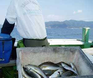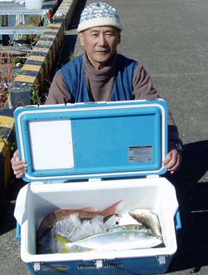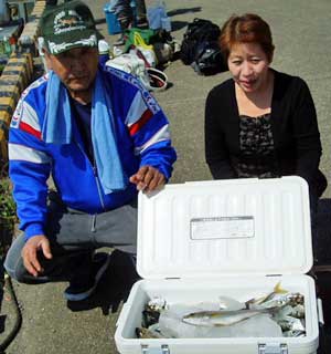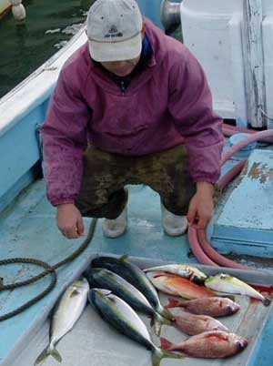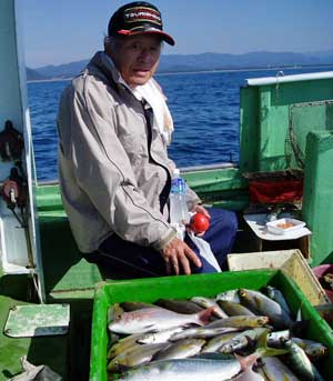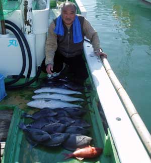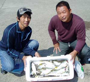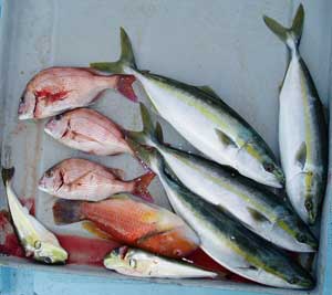 アジ20〜30糎10匹、タイ28〜38糎2匹、ハマチ1