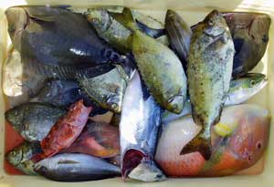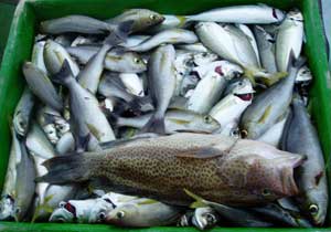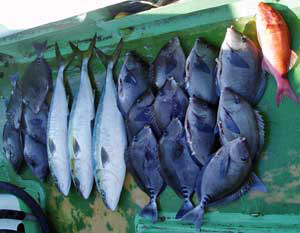 ハタ50糎1匹、アジ25〜33糎50匹、サバ40糎1匹、