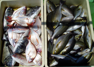 タイ43糎2匹、ヘダイ40糎2匹、ツバメ魚1匹、