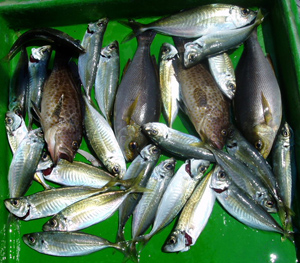 ハタ30糎3匹、マアジ22〜30糎25匹、