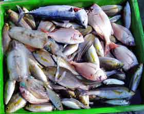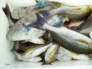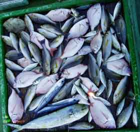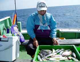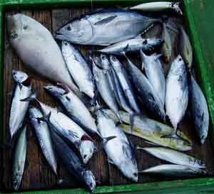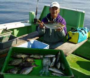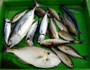 チダイ30糎15匹、アジ、トビウオ、ハゲ、シイラ、