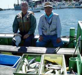 ウスバハゲ55糎1匹、マルソウダ3匹、アジ4匹、
