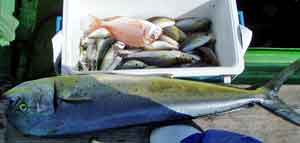 ヨコワ55糎2匹、マルアジ25〜35糎30匹、サバ等