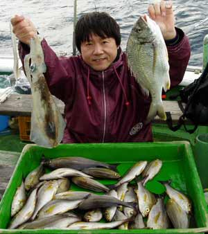 イサギ35糎1匹、ヘダイ35糎1匹、モンゴイカ1匹、