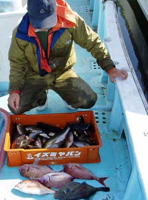 イシダイ40糎1匹、カワハギ30糎1匹、ガシラ6匹、