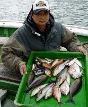 チヌ50糎1匹,ヘダイ35〜40糎,ハマチ46糎1匹