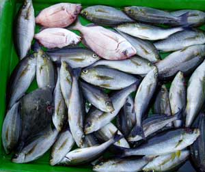 ヒラアジ、カワハギ、アズキハタ、タイ、ベラ、