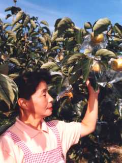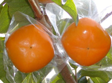 『紀の川柿』は、この柿を9月中旬に樹に成らせた状態でアルコールを入れたポリ袋で果実ひとつひとつていねいに包んで渋を抜きます。 渋抜きが終わった後そのまま樹に成らせておいて完熟になるのを待つのです。 『紀の川柿』のおいしさは完熟≠フおいしさです。 |