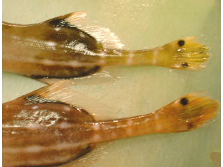 尾びれに上下1〜2黒斑、腹びれに黒斑がある。体長90cm。