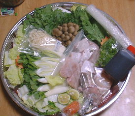 直径35センチの大皿に野菜、ポン酢、マロニー、紅葉おろしなど、いたれりつくせりの内容。