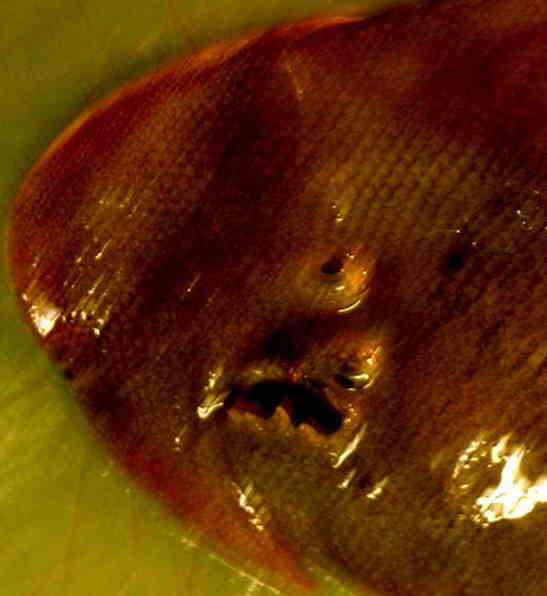 鼻孔は有眼側で1個。吻は鉤(かぎ)状に曲り、その先端は下腹の後縁下に達する。