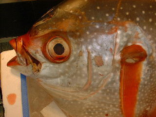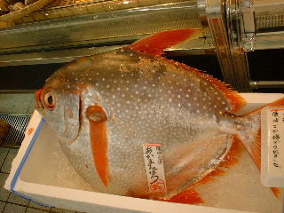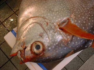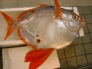 お届パックは背と腹をセットにしています。 あかまんぼうにしては小型(30キロ)なので、肉色が「びんちょうまぐろ」っぽかったです。 大型のものになると、背中の肉はマグロの赤、腹の肉がカジキのようなオレンジ色なのですが… パックから出したら裏返して、皮を御覧ください。 運が良ければ、水玉模様が御覧になれます。(それがどうしたって?) 鮮度的にはばっちしなので、是非お刺身でぉ召し上がりください。