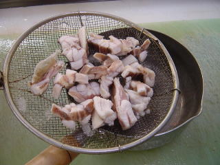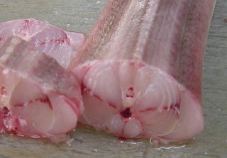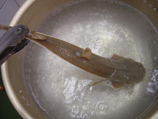 1)頭内臓をとって熱湯に約1分。 2)金たわし等でさめ肌を落とす。 3)一口大に切り落とす。 4)流水にさらす。