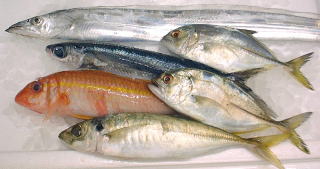 上から「タチウオ」「ギンガメアジ」「トビウオ」「アカヒメジ」「マルアジ」