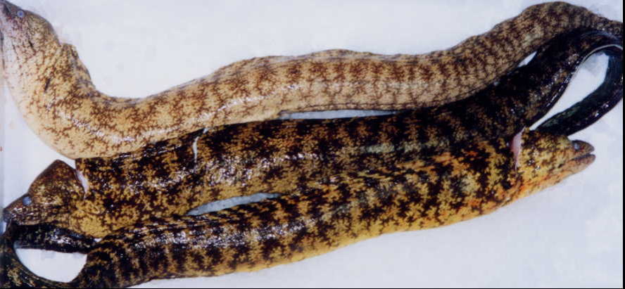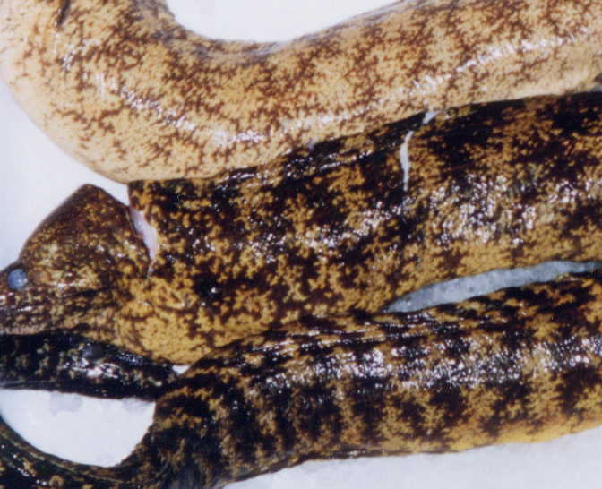 胸びれと腹びれはない。体色は黄褐色の地肌に暗褐色のミミズ状の横帯がある。