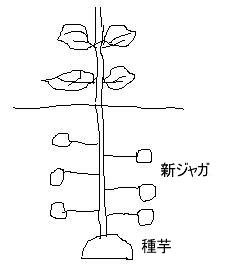 良い種芋だったので一株に4,5本も芽が出ていました。勢いのよいもの2,3本を残して他は取り除きました。この時、種芋を引き上げないように株元を押さえ、斜めの方向に掻き取りました。