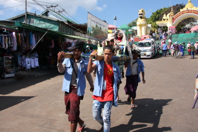 ストランを出て15分くらい緩やかな上り道を歩くと、目的のゴールデンロックが見えた。落ちそうで落ちない大きな不思議な石。人々は崇め、男性だけが金箔を貼れる。私たちのツアーは男性が一人。彼が私たちの代表で、金箔を貼る様子を見ていた。金箔そのものは女性でも売店で買えるので、記念に買っておいた。だいぶ前であるが、タイでは女性も金箔を貼れたので、仏像か何かに金箔を貼った記憶がある。国によって違いがあるらしい。