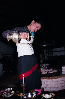 踊りがすんだら疲労感がまた戻ってきた。メインディッシュを食べに2階に下りた。代表的なネパール料理であるダルバート,モモ,ライス,ロキシーが運ばれてきた。ダルバートとは猪の肉,青菜,豆スープ,チキン,ジャガイモなどの料理を総称して言い,客のテーブルに置いてある大皿に,注文に応じて適量を入れる。私は食欲がないが,味見はしておきたかったので,すべての種類を少しずついれてもらった。アロンさんに「食べなくちゃ治らないよ」と言われたが食べる気がしないのだから仕方ない。それでも少し食べてみた。しかし,体調が悪いので,どれを食べても美味しく感じられなかった。ロキシーを強く勧められたので,一口なめてみた。前に日本食レストランで飲んだものとは雲泥の差のアルコール度だった。きつくて舌がピリピリした。アロンさんはこれを湯水のごとく飲んでいた。彼はロキシーに火をつけた。それに指先をひたすと指先から炎が出た。試してみないかと言われ,Kさんはやった。私は怖かったのでやらなかった。今,思えばやってみてもよかったかなと思っている。