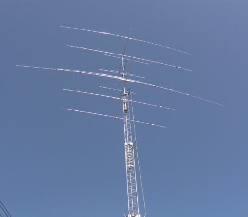 アンテナはFTI製のクランクアップタワー、4段の上に50メガ・4エレヤギ、10メガ・2エレHB9CV、14,21,28・4エレヤギ、7メガと3.5メガはロータリーダイポールです。