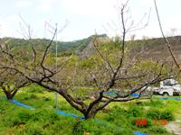 てっちゃんは1回目の防除作業を終え、梅畑に米の精の入った肥料を