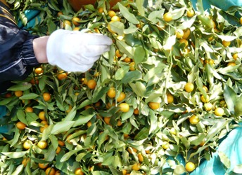 葉っぱを付けた状態で採って葉をハサミで切って、粒にしています。