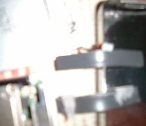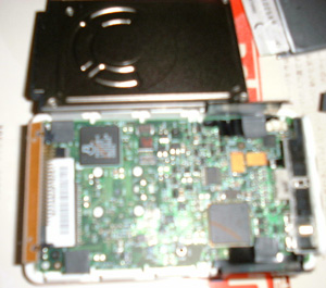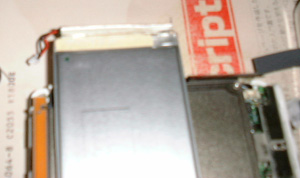 HDDを外したところ。 HDDは、四隅が小さな両面テープで固定されています。 ケーブル側がオス端子、HDD側はメス端子になっています。HDDを抜くときは、ケーブルに気を付けます。 |