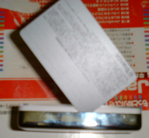 薄いプラスチック製のカードを側面金属ケースに差し込む。 ヤマダデンキのポイントカードを使ったが、テレホンカードなども良いと思います。 |