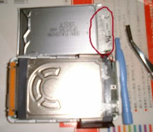 電池を外したところ。 電池はHDDの上に両面テープで取り付けています。 HDDのフラットケーブル、電池のコードと端子部分(赤丸)を破損しないよう気を付けながらゆっくりテープをはがします。 |