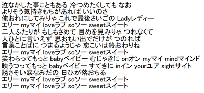 | 歌詞を閲覧出来るサイトは幾つか有りますが、アドビ社のフラッシュで作られており、コピー出来ない場合があります。 例えば、うたネット(http://www.uta-net.com/)の場合、サザンオールスターズの「いとしのエリー」のURLは、「http://www.uta-net.com/user/phplib/view.php?ID=702」です。 ソースコードを表示させると、 <!-- 試聴ボタンここまで --> <h2>いとしのエリー</h2> </div> <div class="artist_etc clearfix"> <div class="access_count">この曲の表示回数 <span>417,734</span>回</div> ・・・・・・・・・・・・・・・・・・・・・・・・・・・・・・・・・・・・・・・・・・・・・・・ ・・・・・・・・・・・・・・・・・・・・・・・・・・・・・・・・・・・・・・・・・・・・・・・ <p id="flash_area"> <link rel="stylesheet" type="text/css" href="/css/view_ipad.css" media="screen"><span id="ipad_kashi" style="width:560px;height:735px;" onclick="return;" onkeypress="return;"><img src="/user/phplib/svg/showkasi.php?ID=702&WIDTH=560&HEIGHT=735&FONTSIZE=15&t=1489841502" height="735" width="560" type="image/svg+xml" onclick="return;" onkeypress="return;" wmode="transparent" /></span> </p> のようになっています。 img src="/user/phplib/svg/showkasi.php?ID=702 に注目すると、 サザンオールスターズの「いとしのエリー」のURLは、「http://www.uta-net.com/user/phplib/view.php?ID=702」だったから、「http://www.uta-net.com/user/phplib/svg/showkasi.php?ID=702」と打ち込んで移動すると・・・ ![]() ID部分は同じで、「http://www.uta-net.com/user/phplib/view.php?」を 「http://www.uta-net.com/user/phplib/svg/showkasi.php?」と、view.php? を svg/showkasi.php? に変えます。 この画面からマウスで選択できない場合は、画面内でマウスを右クリックし、ポップアップメニューから「すべてを選択」を左クリックします。 文字に色付けされた状態から、マウスを右クリックし、「コピー」を左クリックして、メモ帳などに貼り付けます。 もしくは、この画面でソースコードを表示させすべてをコピーし、メモ帳などに <html> <head> <title>KASHI</title> </head> <body> コピーした部分 </body> </html> のように記述して、拡張子を.htmlもしくは.htmにして保存(例えば .kashi.html という具合)し、保存したものを開いて下さい。 歌詞GET!!(http://www2.kget.jp/)の場合の同曲は、http://www.kget.jp/lyric/7517/ ソースコードより、 <!-- facebook sdk once include start--> <div id="fb-root"></div> <script>(function(d, s, id) { var js, fjs = d.getElementsByTagName(s)[0]; if (d.getElementById(id)) return; js = d.createElement(s); js.id = id; js.src = "//connect.facebook.net/ja_JP/all.js#xfbml=1"; fjs.parentNode.insertBefore(js, fjs); }(document, 'script', 'facebook-jssdk'));</script> <!-- facebook sdk once include end--> <div id="lyric-trunk"> の下に 泣かした事もある 冷たくしてもなお のような部分があるから <!-- close #lyric-trunk --> <!-- // 2015/06/04 インリードアド プレイヤータグ --> の手前 </div> まで、「<div id="lyric-trunk"> から </div> まで」をすべてをコピーし、メモ帳などに <html> <head> <title>KASHI</title> </head> <body> コピーした部分 </body> </html> のように記述して、拡張子を.htmlもしくは.htmにして保存(例えば .kashi.html という具合)し、保存したものを開いて下さい。 歌詞ナビ(http://kashinavi.com/)の場合の同曲は、http://kashinavi.com/song_view.html?12698 ソースコードより、<!-- 歌詞ナビ レスポンシブ --> から少し下の部分 <table border=0 cellpadding=0 cellspacing=0><tr><td>作詞 : 桑田佳祐<br>作曲 : 桑田佳祐</td></table> <center> <hr noshadesize=1> <div align=left> <script type="text/javascript" src="/kashi.php?no=12698"></script> <hr noshadesize=1> </div> /kashi.php?no=12698 に注目します。 http://kashinavi.com/kashi.php?no=12698 に移動すると、 document.write("<p oncopy='return false;' unselectable='on;'><table><tr><td>泣かした事もある 冷たくしてもなお<br>よりそう気持ちがあればいいのさ<br>俺にしてみりゃ これで最後の Lady<br>エリー My love so sweet</td><tr><td> <br></td><tr><td>二人がもしもさめて 目を見りゃつれなくて<br>人に言えず思い出だけがつのれば<br>言葉につまるようじゃ恋は終りね<br>エリー My love so sweet</td><tr><td> <br></td><tr><td>笑ってもっと Baby むじゃきに On my mind<br>映ってもっと Baby すてきに In your sight<br>誘い涙の日が落ちる<br>エリー My love so sweet<br>エリー My love so sweet</td><tr><td> <br></td><tr><td>あなたがもしもどこかの遠くへ行きうせても<br>今までしてくれたことを忘れずにいたいよ<br>もどかしさもあなたにゃ程よくいいね<br>エリー My love so sweet</td><tr><td> <br></td><tr><td>笑ってもっと Baby むじゃきに On my mind<br>映ってもっと Baby すてきに In your sight<br>みぞれまじりの心なら<br>エリー My love so sweet<br>エリー My love so sweet</td><tr><td> <br></td><tr><td>笑ってもっと Baby むじゃきに On my mind<br>映ってもっと Baby すてきに In your sight<br>泣かせ文句のその後じゃ<br>エリー My love so sweet<br>エリー My love so sweet<br>エリー My love<br>エリー</td></table><p>") その部分をすべてをコピーし、メモ帳などに <html> <head> <title>KASHI</title> </head> <body> document.write("<p oncopy='return false;' unselectable='on;'><table><tr><td>泣かした事もある 冷たくしてもなお<br>よりそう気持ちがあればいいのさ<br>俺にしてみりゃ これで最後の Lady<br>エリー My