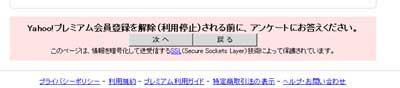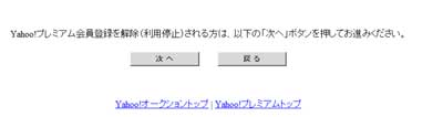 リンク先ページ下部の::Yahoo!プレミアム会員登録を解除(利用停止)される方は、以下の「次へ」ボタンを押してお進みください。::に従い「次へ」をクリック。 |