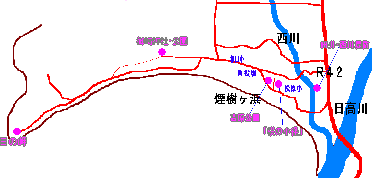 今回撮影した美浜の桜開花のポイントです。(●印) このほかにも、吉原公園から和田小学校にかけての県道沿いにも、多くの花が咲きます。 見頃は、例年3月下旬から4月上旬にかけてです。 車で来られた場合の、駐車スペースは「田井・西川堤防」以外は、すぐ近くに駐車場や空き地などがあります。