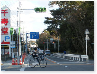 県道を東進すると(和田方面から御坊市方面に向かって)千寿堂前の交差点(松洋中学校からの道路と県道柏・御坊線の交差点)に信号機が設置されています。すぐ向こうにも今までからある信号機が見えます。