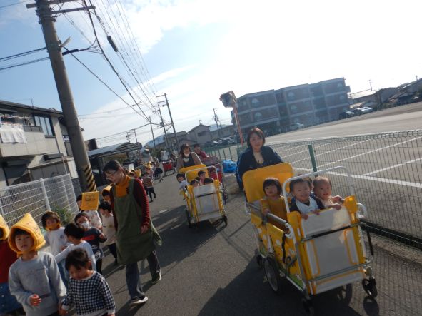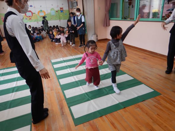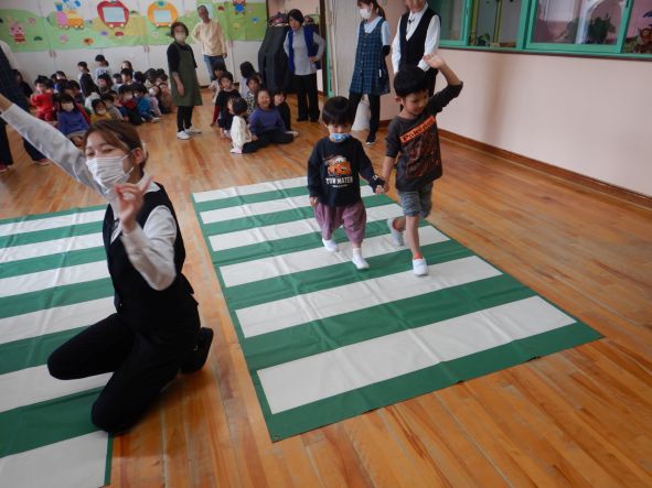 信号機の見方を人形劇やビデオできっちり学びました。横断歩道 を渡る際、信号機を見て自分で判断して渡る経験をしました。 渡り始めて黄色になると咄嗟の判断にドギマギしたよ。