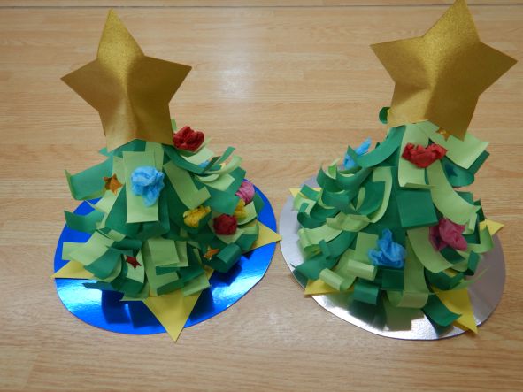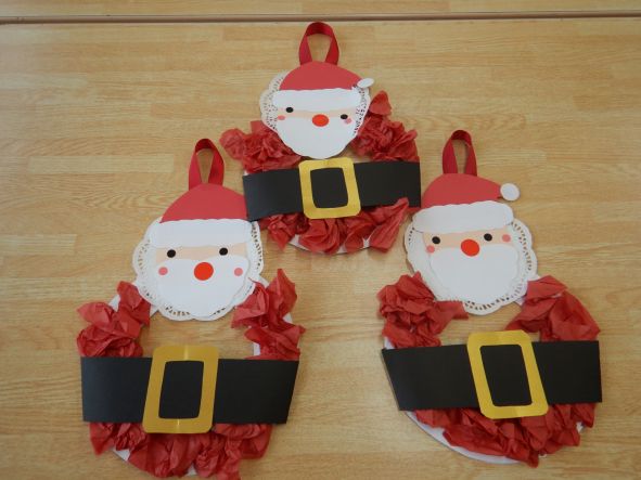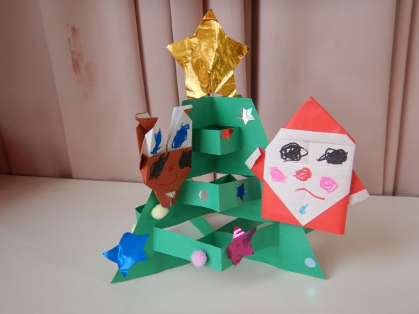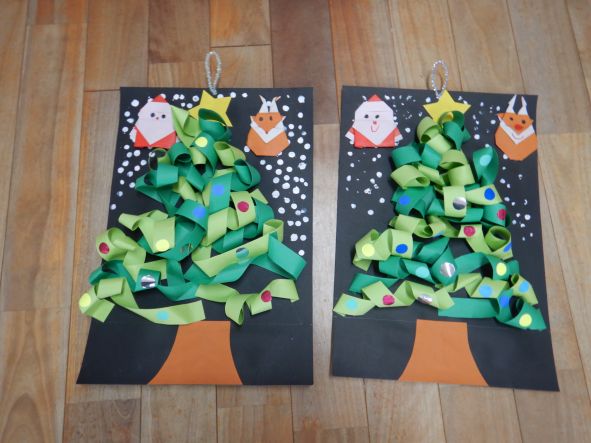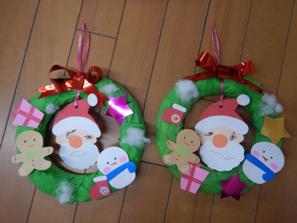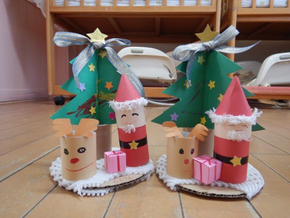 クリスマス用に早目につくりました。早速お家に飾ります。 作品は左からさくら組、もも組、ふじ組の順です。
