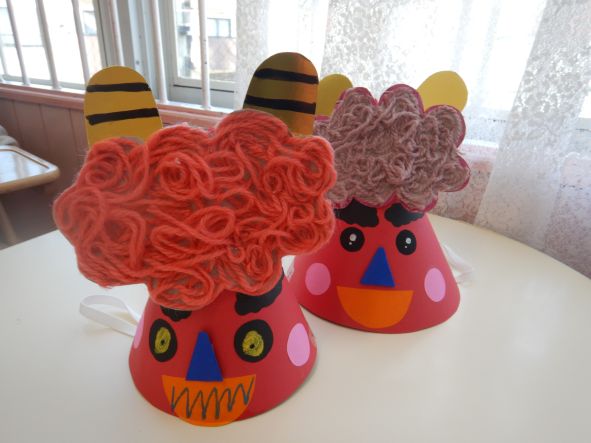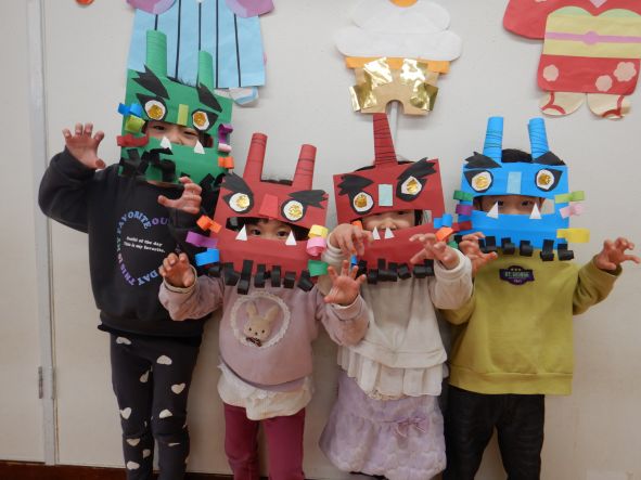 お家で豆まきするのが楽しみ! 左からきく組、ばら組、ゆり組の面です。