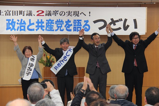和歌山の日本共産党南地区委員会は4月7日、上富田町議選(4月24日告示・29日投票、定数12)を前に、大門みきし(Facebook twitter)参院議員を招いた「政治と共産党を語るつどい」を同町で開催。くきゆみ子町議(69歳)、よしもと和広町議予定候補(59歳)の必勝で1議席増を訴えました。