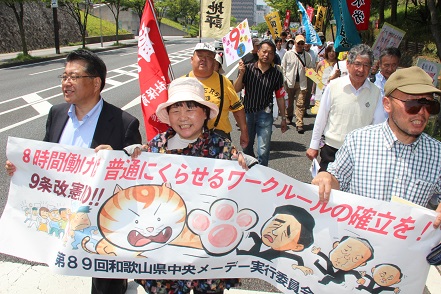 和歌山県では9ヵ所開かれ、和歌山市の県中央メーデーには1,000人が参加。県地評の琴浦龍彦議長は開会あいさつで、改ざん・隠ペい・ねつ造・セクハラの安倍政権を批判し、「今こそ力を合わせ、安倍内閣を倒そう」と訴えました。市民連合わかやまの豊田泰史氏が地方選挙でも市民と野党の共闘をよびかけ、和歌山市長選に立候補を表明した島久美子氏が来賓あいさつ。日本共産党の奥村規子(Facebook)県議は、この間の県内地方選での日本共産党の前進を「安倍政権への怒りが結びついた」と強調しました。